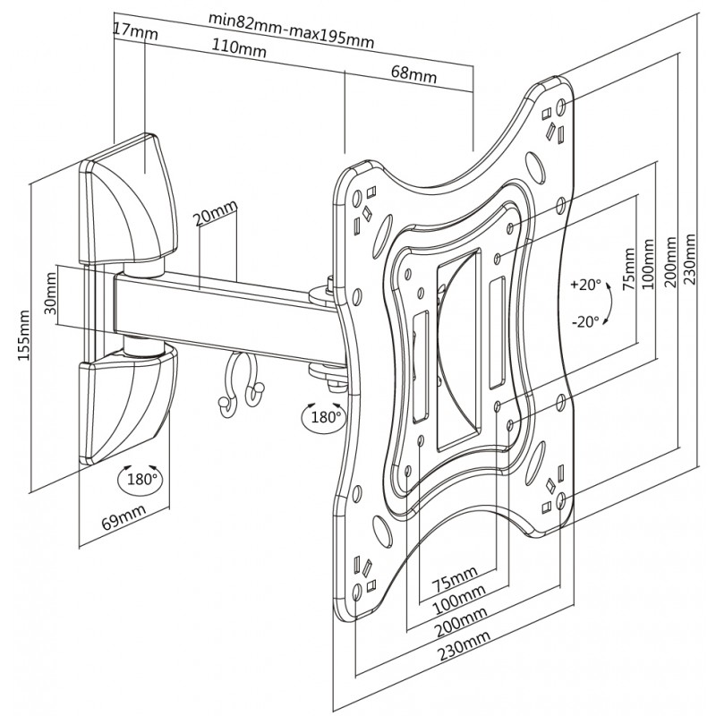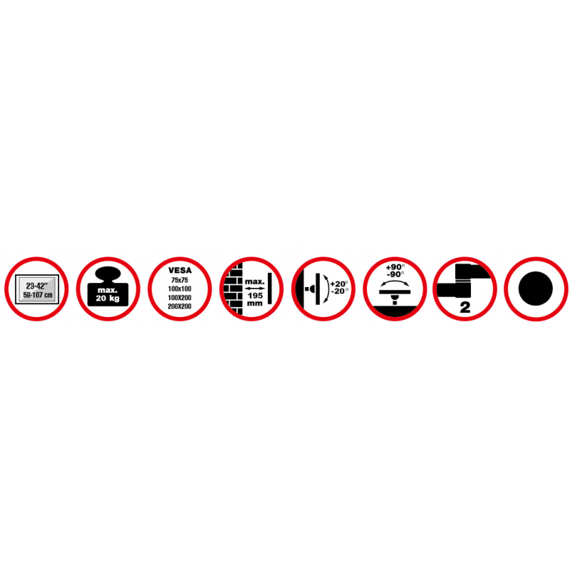 The model FLEXO 42-2020T2 is designed to fit any 23"-42" Flat Panel TV up to 20kg. Simple construction allows easy installation. Full motion allows maximum flexibility — extend, tilt and swivel your TV up to 195mm from the wall for easy viewing from any seat in a room. Cable clip included keeps cables organized. VESA compatible with 75x75, 100x100, 200x100, 200x200.