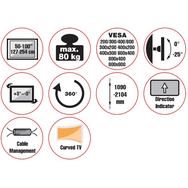 The PALLAS 100-8060T is a super heavy-duty model made for large TVs. It will hold a screen up to 100”/ 80kg. High-quality material combined with a strengthened structure makes for an extraordinary supporting ability. In addition, they are suitable for flat or pitched ceiling installation, and have telescopic poles for different height level needs, offering maximum compatibility and flexible application. Besides, the free tilting & swiveling VESA ensures the optimal viewing experience for the viewers.
