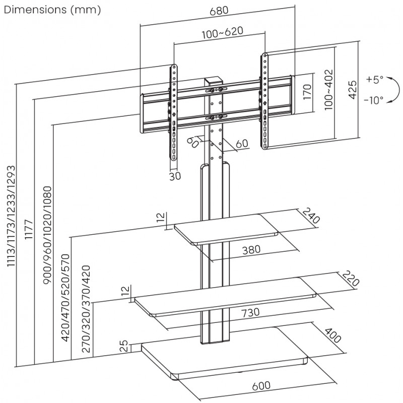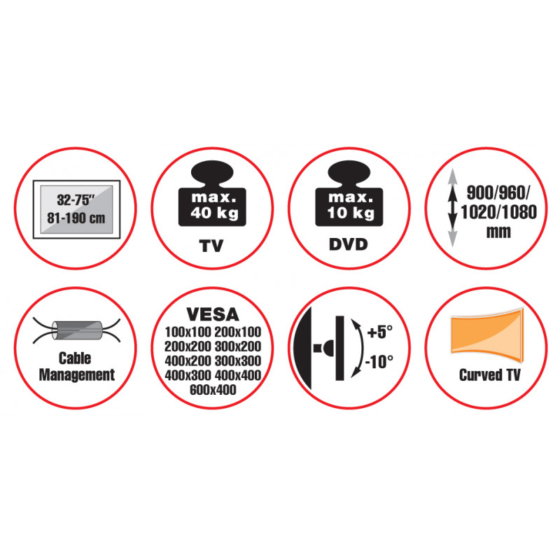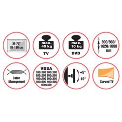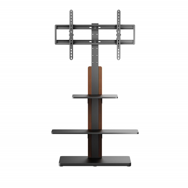 The TV Stand Elegant 75BWS2 allows for 4-level height adjustments of the screen, and it also enables tilting the screen up or down to achieve the perfect viewing angle. 2 shelves offer ample storage space for AV devices, remote controls, soundbars, and other items. The cable management system at the back of the stand helps organize messy wires, ensuring a clean and tidy setup.