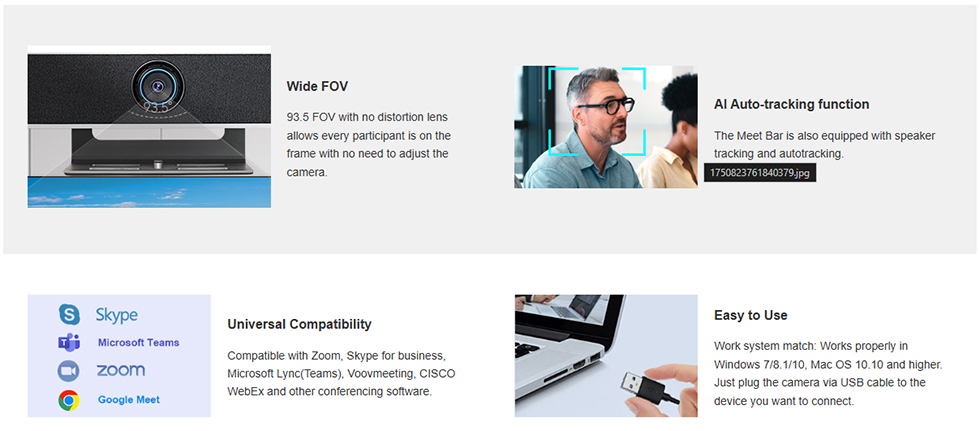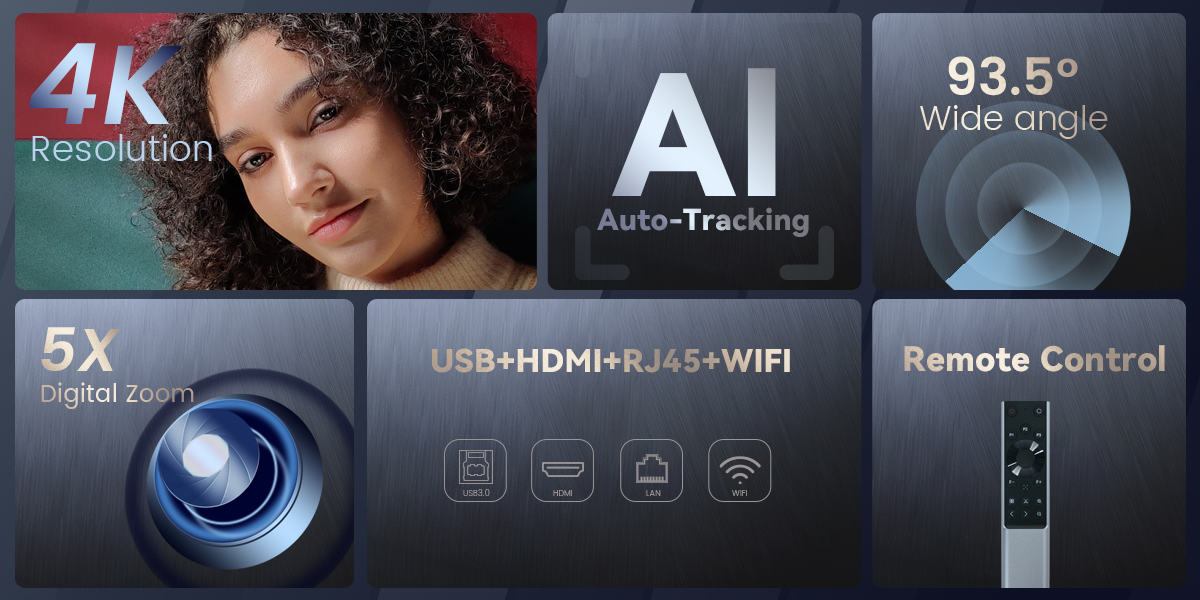| AI Modes | Single person tracking, speaker tracking, participant tracking, close-up of speaker |